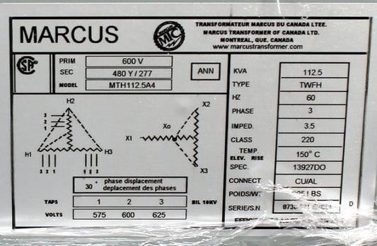 112.5 kVA Marcus Reconditioned Transformer 600-277/480V Cat No MTH112.5A4 SKU 3475