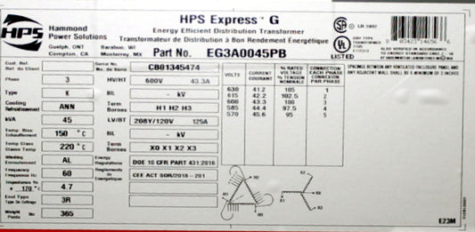 45 kVA HPS New Transformer 600-208Y/120V Cat No EG3A0045PB SKU 1019