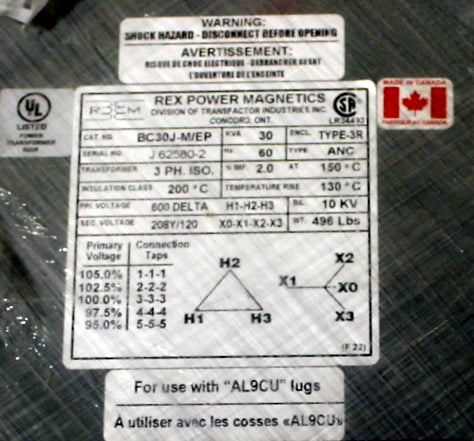 30 kVA REX Reconditioned Transformer 480-600/347V Cat No BC30HQ/X SKU 3066