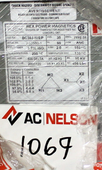 30 kVA REX New Transformer 600-120/208V Cat No BC30J-M/EP SKU 1068