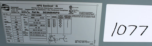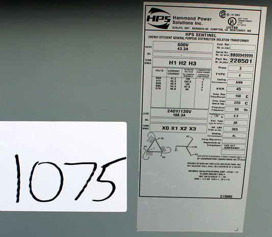 45 kVA HPS New Transformer 600-240/139V Cat No 228501 SKU 1075