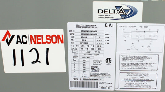 45 kVA Delta Reconditioned Transformer 600-120/208V Cat No DA3045V SKU 3464