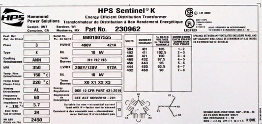 350 kVA HPS Reconditioned Transformer 480-120/208V Cat No 230962 SKU 3357