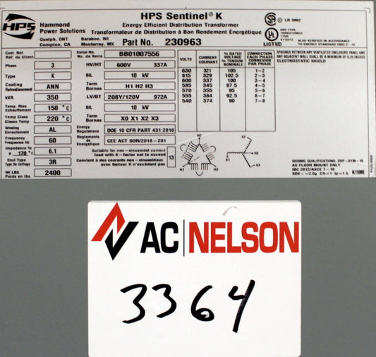 350 kVA HPS Reconditioned Transformer 600-120/208V Cat No 230963 SKU 3364