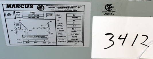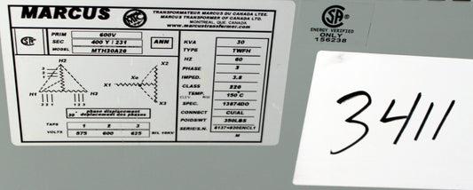 30 kVA Marcus Reconditioned Transformer 600-400/231V Cat No MTH30A20 SKU 3412