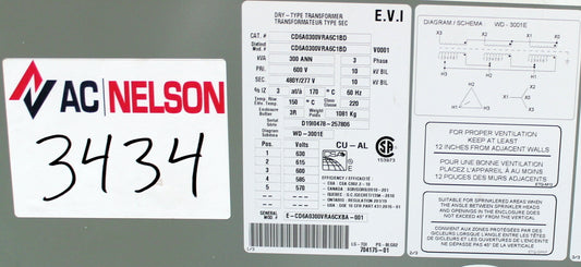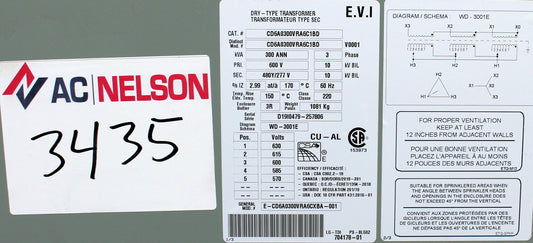 300 kVA Delta Reconditioned Transformer 600-277/480V Cat No CD6A0300VRA6C1BD SKU 3434