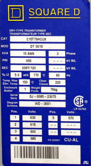 15 kVA SQD New Transformer 600-208Y/120V Cat No C15T79HCUX SKU 1018