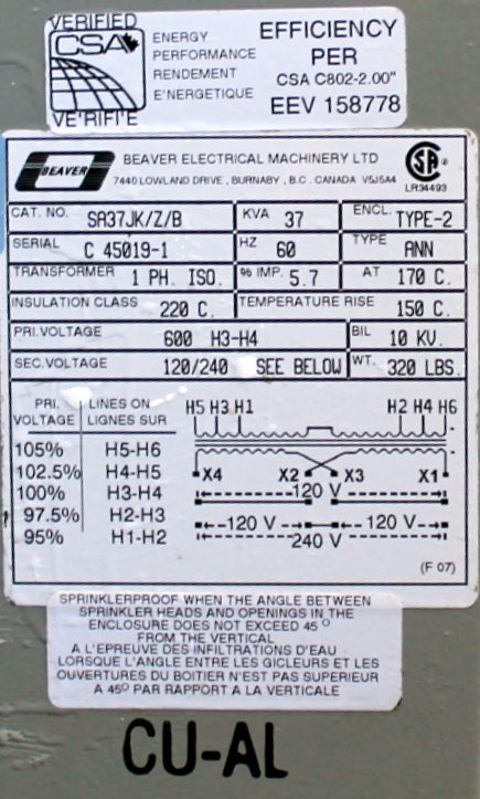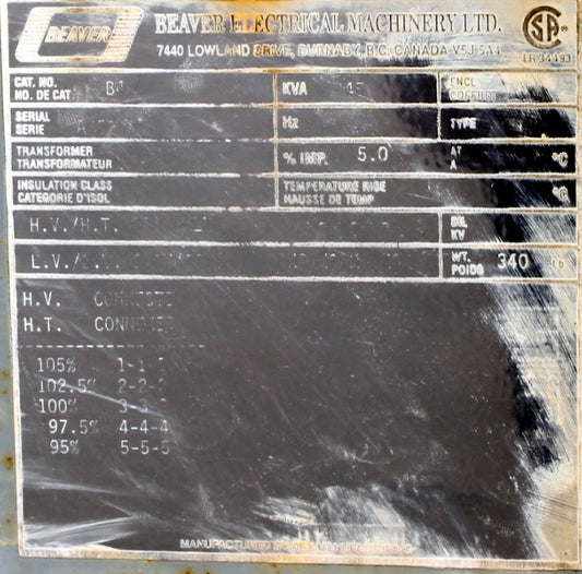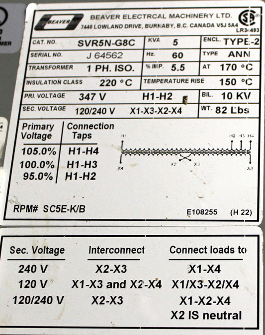 5 kVA BEAVER New Transformer 347-120/240V Cat No SVR5N-G8C SKU 1026