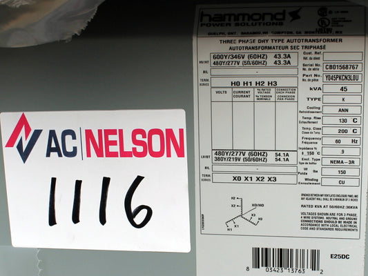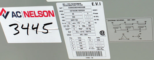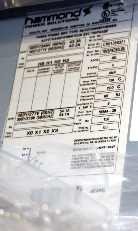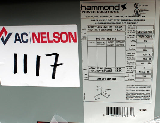 45 kVA HPS New Transformer 600Y/346/480Y/277-480Y/277/380Y/219V Cat No Y045PKCN3LOU SKU 1059