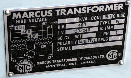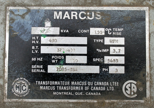 37.5 kVA Marcus Reconditioned Transformer 480-120/240V Cat No 14748-1081 SKU 3468