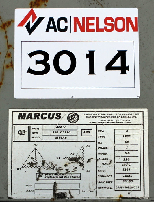 6 kVA MARCUS Reconditioned Transformer 600-380/220V Cat No MT6A6 SKU 3014