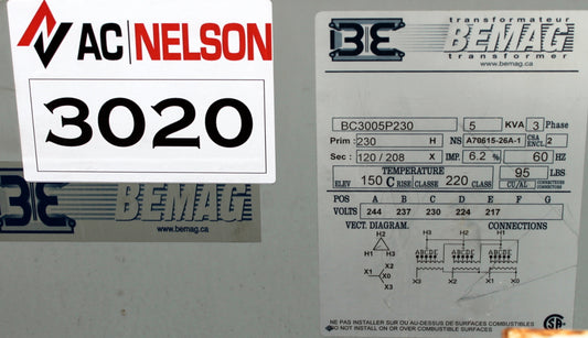 5 kVA BEMAG Reconditioned Transformer 230-120/208V Cat No BC3005P230 SKU 3020