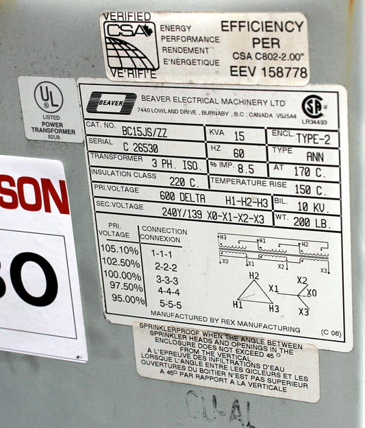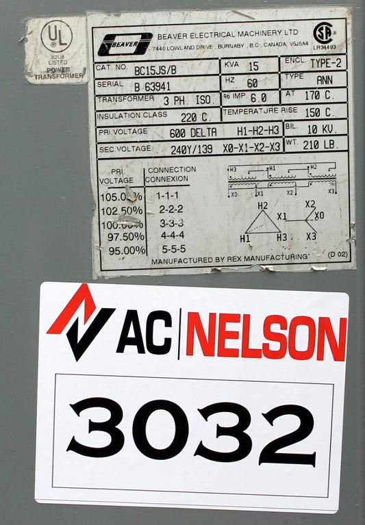 15 kVA REX Reconditioned Transformer 600-240/139V Cat No BC15JS/B SKU 3032