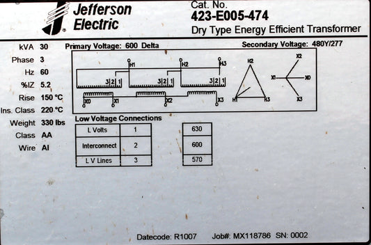 30 kVA JEFFERSON Reconditioned Transformer 600-277/480V Cat No 423-E005-474 SKU 3043