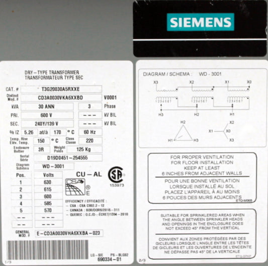 30 kVA SIEMENS Reconditioned Transformer 600-240/139V Cat No T3G20030A5RXXE SKU 3064
