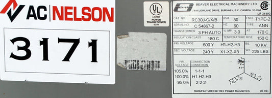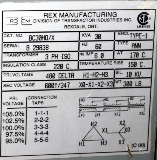 30 kVA REX Reconditioned Transformer 480-600/347V Cat No BC30HQ/X SKU 3066