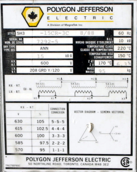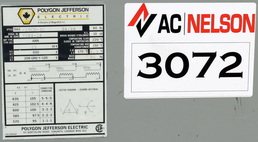 15 kVA POLYGON JEFFERSON Reconditioned Transformer 600-120/208V Cat No 5H3-15CR-3C SKU 3069