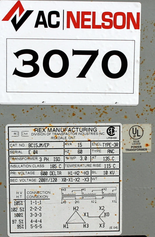 15 kVA REX Reconditioned Transformer 600-120/208V Cat No BC15JM/EP SKU 3070