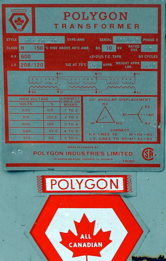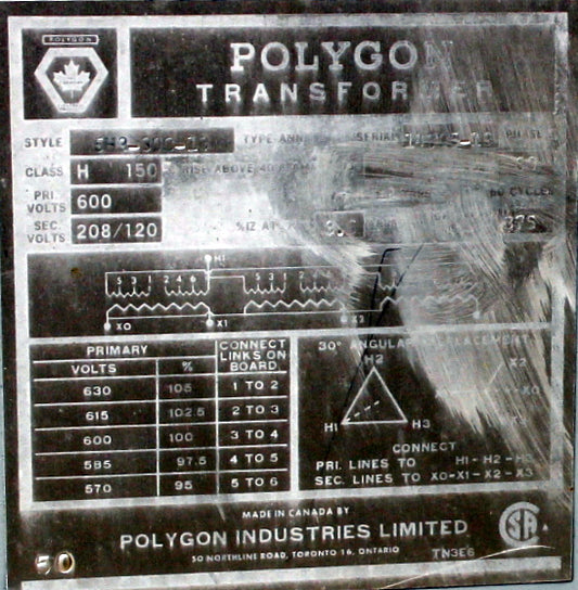 15 kVA POLYGON Reconditioned Transformer 600-120/208V Cat No 5H3-15C-16 SKU 3071