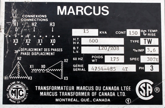 15 kVA MARCUS Reconditioned Transformer 600-120/208V Cat No 4764-485 4T SKU 3081