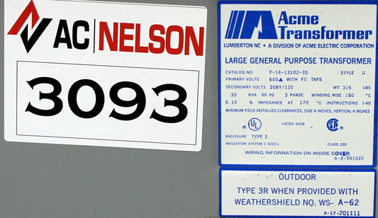 30 kVA ACME Reconditioned Transformer 600-120/208V Cat No TIA13102-35 SKU 3093