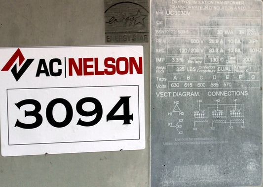 30 kVA HPS Reconditioned Transformer 600-120/208V Cat No K309K TEMP PWR PNL SKU 3274