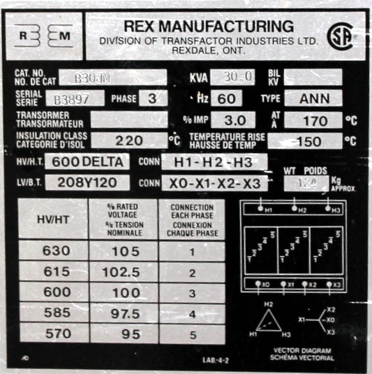 30 kVA REX Reconditioned Transformer 600-120/208V Cat No B30JM SKU 3095