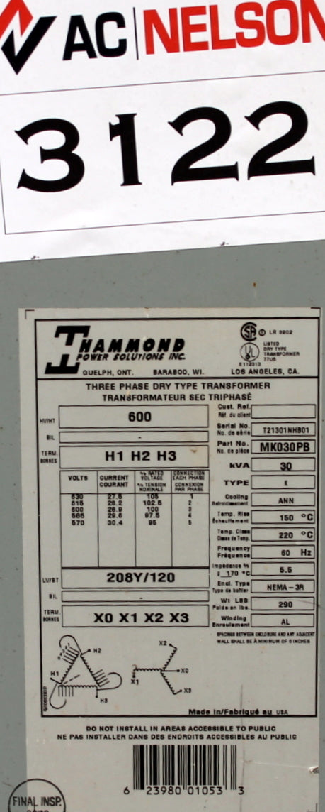 30 kVA HPS Reconditioned Transformer 600-120/208V Cat No MK030PB SKU 3122