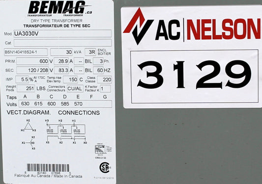 30 kVA BEMAG Reconditioned Transformer 600-120/208V Cat No UA3030V SKU 3129
