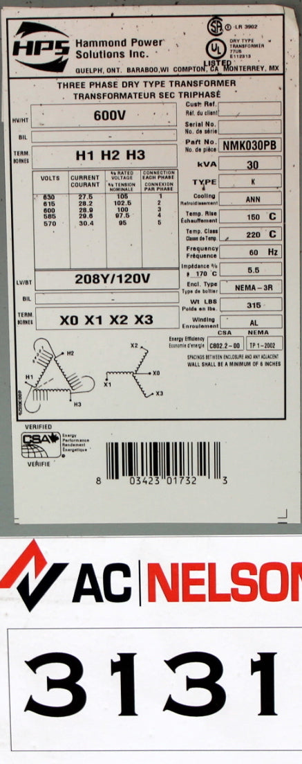 30 kVA HPS Reconditioned Transformer 600-120/208V Cat No NMK030PB SKU 3131