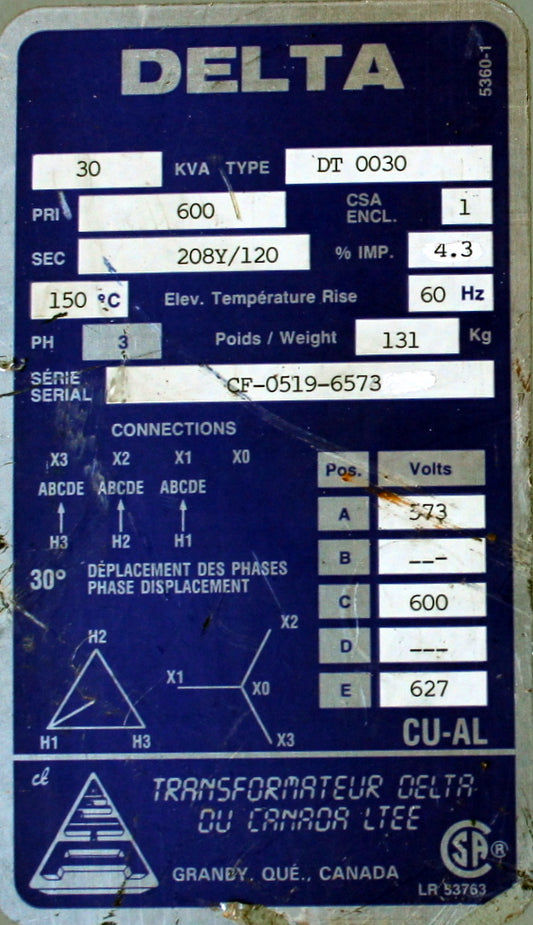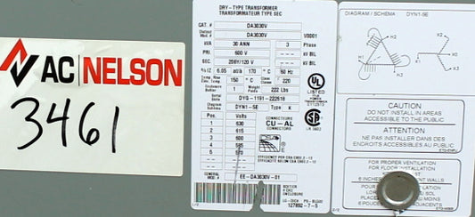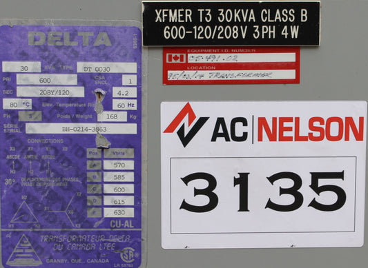 30 kVA Delta Reconditioned Transformer 600-120/208V Cat No DA3030V SKU 3461