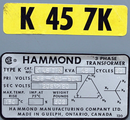 45 kVA HPS Reconditioned Transformer 480-120/208V Cat No K457K SKU 3153