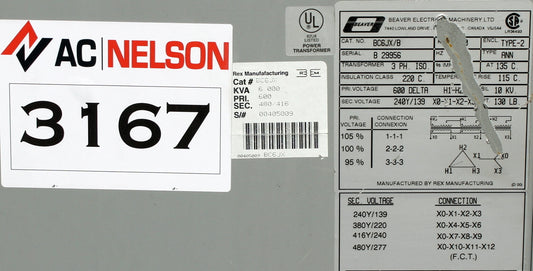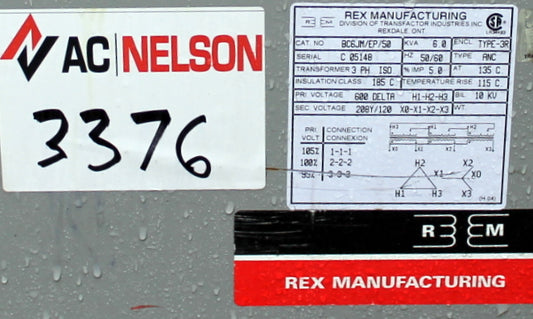 6 kVA REX Reconditioned Transformer 600-120/208V Cat No BC6JM/EP/50 SKU 3376