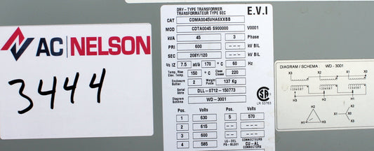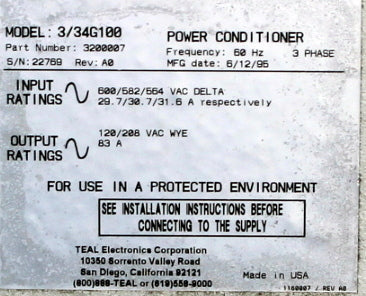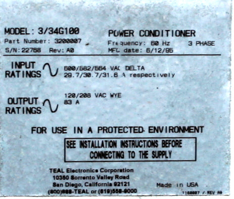 TEAL PWR COND Reconditioned Transformer 600-120/208V Cat No 3/34G100 SKU 3187