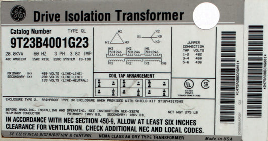 20 kVA GE Reconditioned Transformer 460-230/133V Cat No 9T23B4001G23 SKU 3240