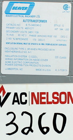 75 kVA BEAVER Reconditioned Transformer 480Y/277-240Y/139V Cat No SA25C-J/E3R/23 SKU 3260