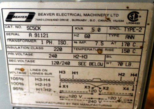 5 kVA Rex Reconditioned Transformer 240-120/240V Cat No SC5CK SKU 3401