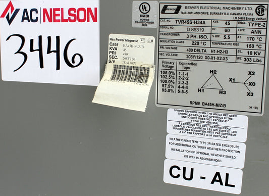 45 kVA Rex Reconditioned Transformer 480-120/208V Cat No TVR45S-H34A SKU 3446