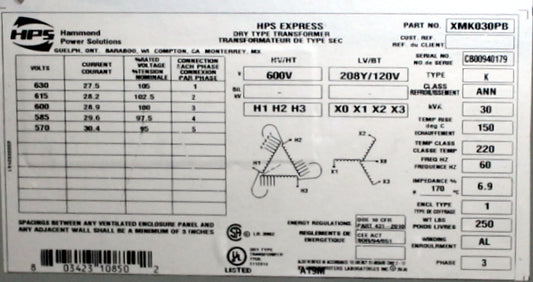 30 kVA HPS New Transformer 600-208Y/120V Cat No XMK030PB SKU 1020