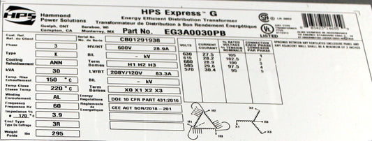 30 kVA HPS New Transformer 600-208Y/120V Cat No EG3A0030PB SKU 1027