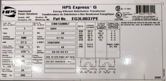 37.5 kVA HPS New Transformer 600-120/240V Cat No EG3L0037PE SKU 1049
