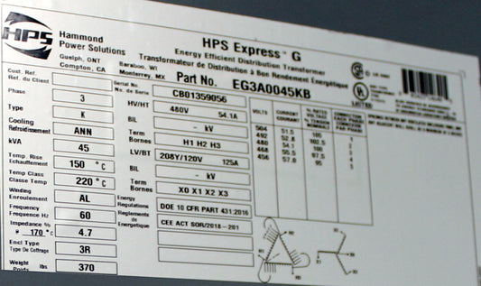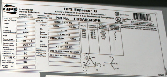 45 kVA HPS New Transformer 600-208Y/120V Cat No EG3A0045PB SKU 1053