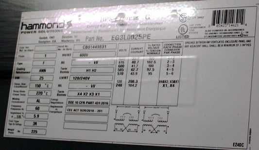 25 kVA HPS New Transformer 600-120/240V Cat No EG3L0025PE SKU 1062