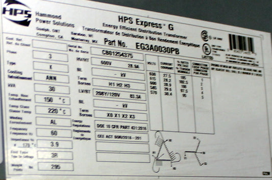 30 kVA HPS New Transformer 600Y/346-208Y/120/240Y/139V Cat No Y030QTCN3LOU SKU 1021