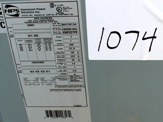 37.5 kVA HPS New Transformer 600-120/240V Cat No XMF037PE SKU 1074