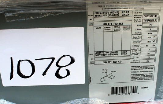 75 kVA HPS New Transformer 600/346-480/277V Cat No Y075PKCN3LOU SKU 1078