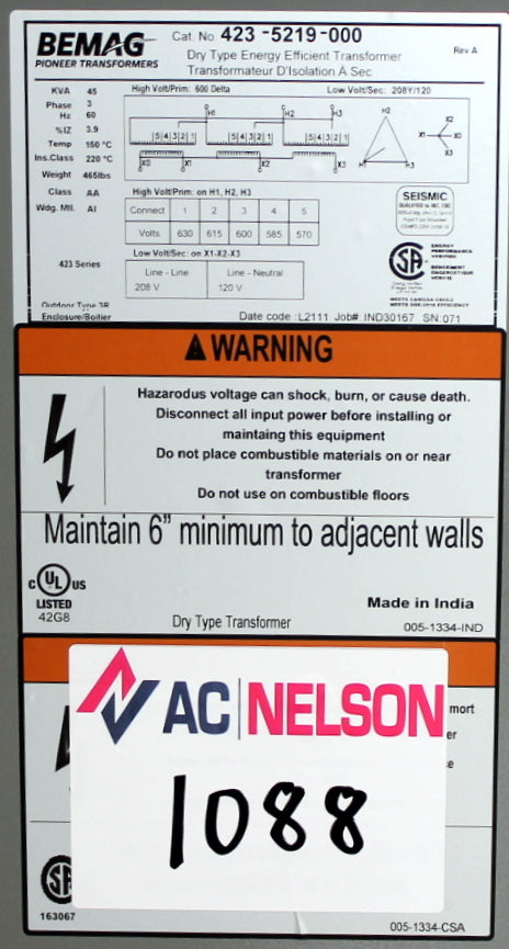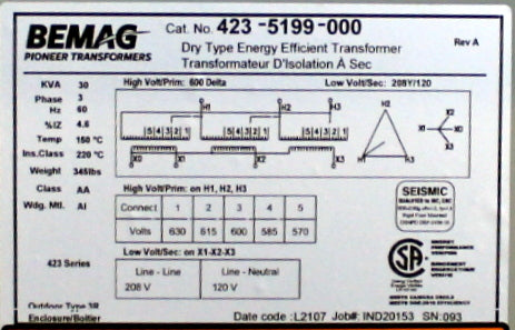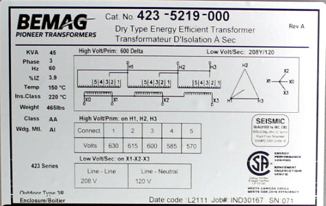 45 kVA BEMAG New Transformer 600-120/208V Cat No 423-5219-000 SKU 1110