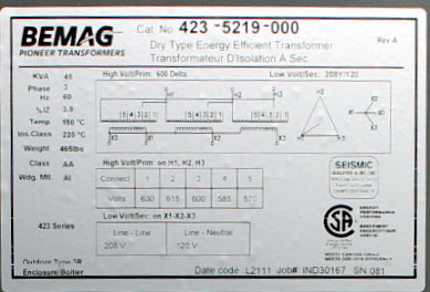 45 kVA BEMAG New Transformer 600-120/208V Cat No 423-5219-000 SKU 1111