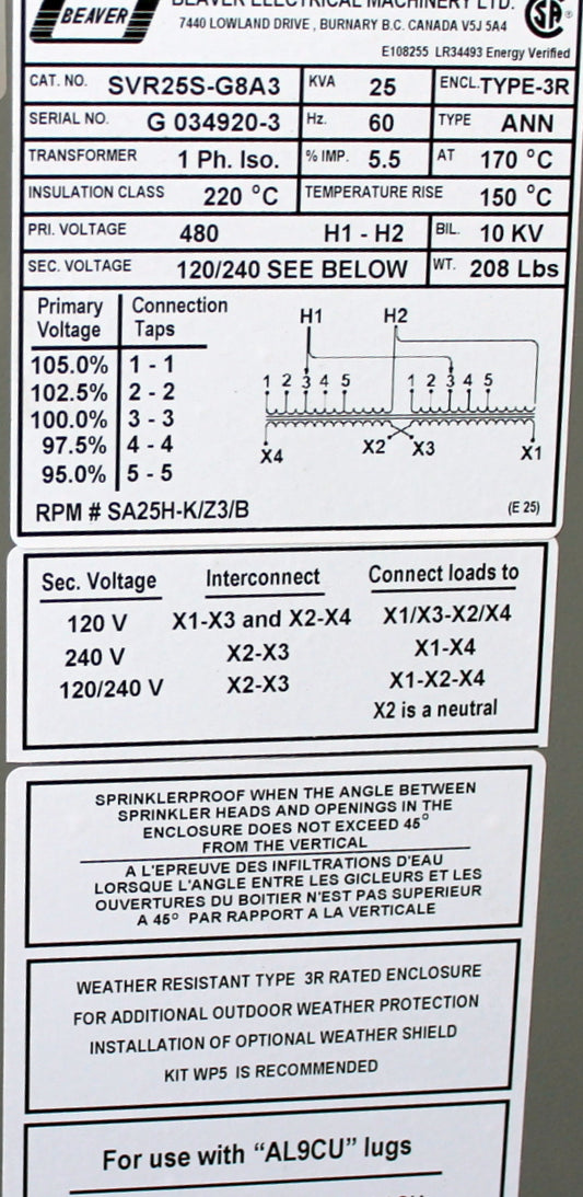 37.5 kVA BEAVER New Transformer 480-120/240V Cat No SVR37S-G8A3 SKU 1046