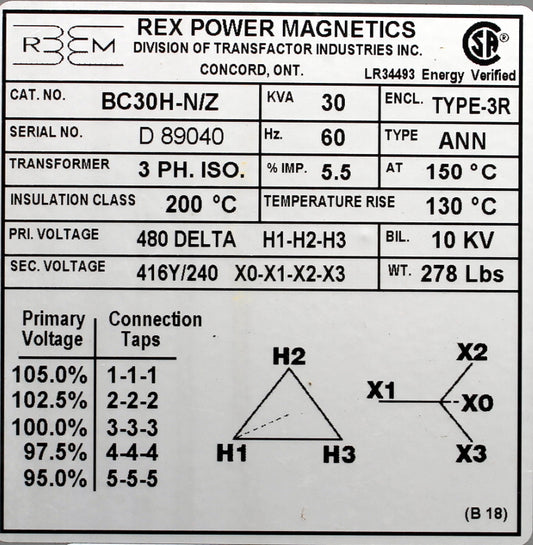 30 kVA REX Reconditioned Transformer 480-416/240V Cat No BC30H-N/Z SKU 3044